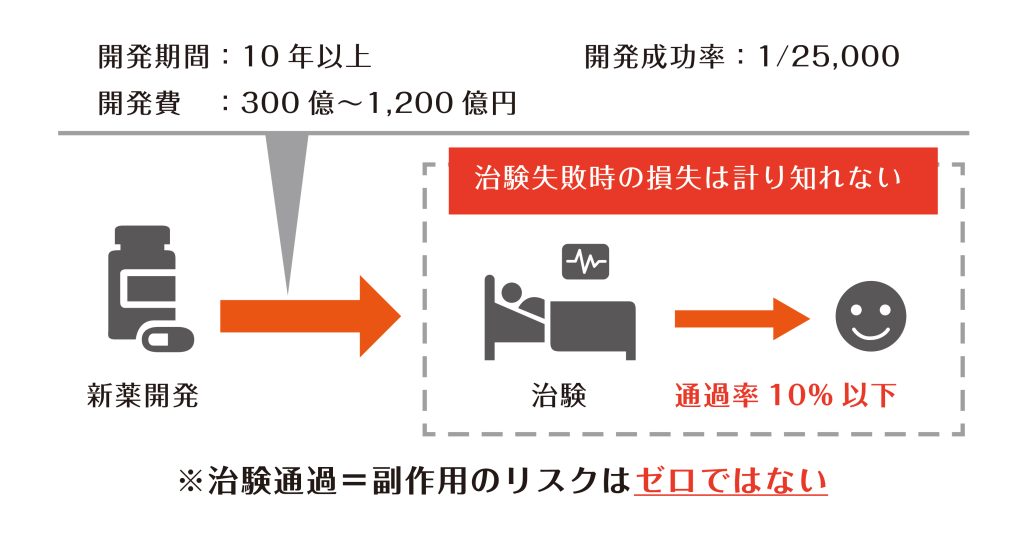 つまり、治験通過率を向上させることができ、莫大な研究開発費の損失を防ぐことができます。