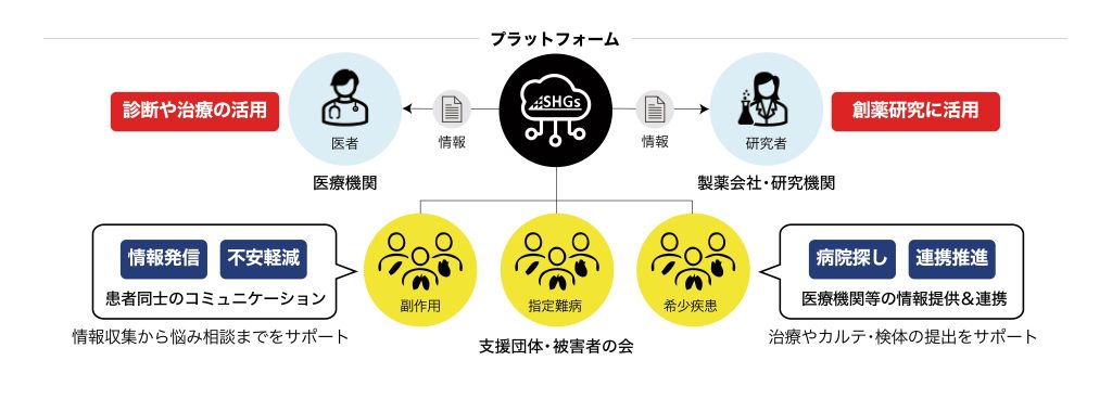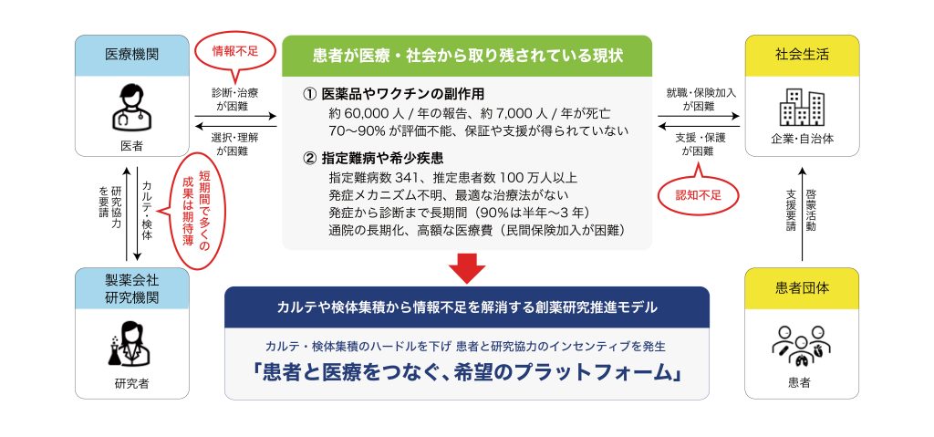 医薬品副作用は年々深刻化しています。2018年から6,000人以上の副作用が疑われる死亡が報告され続け、その 70~90%以上が「情報不足」による評価不能とされています。故に十分な保証や支援が受けられない場合がほとんどです。また、指定難病や希少疾患の患者様についても、患者間や医療・社会における「情報不足」により、診断までに長期間を要す場合があります。これらの疾患は有効な治療法が存在せず、通院が長期化するため、民間保険への加入も難しくなります。診断後は支援を受ける事ができますが、高額な医療費の自己負担に苦しむ傾向があります。このように、現状の医療・社会体制から取り残された人々が助けを求めて、多くの患者団体が社会に向けて声を上げています。しかしながら、迅速な診断や創薬研究の足枷となる「情報不足」は解消されていません。また、患者やその家族は、同じ境遇にある仲間との交流や正しい医療情報を強く求めています。つまり、全国の患者様の貴重な体験やデータを共有する場を生み出す事で、患者様のQOL向上と新しい治療法の開発に貢献すると確信しています。